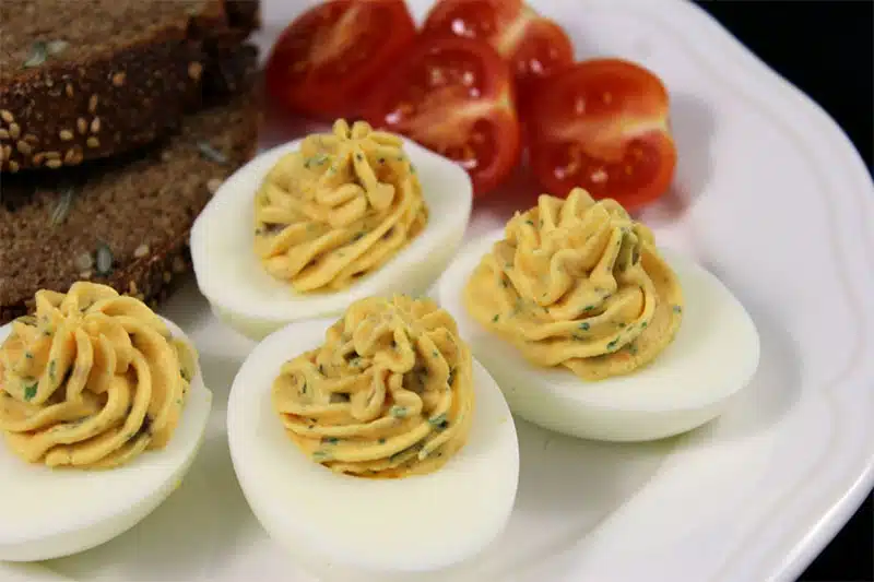 Remplissez vos blancs d’œufs durs de cette préparation à l’aide d’une poche à douille puis décorez et servez.